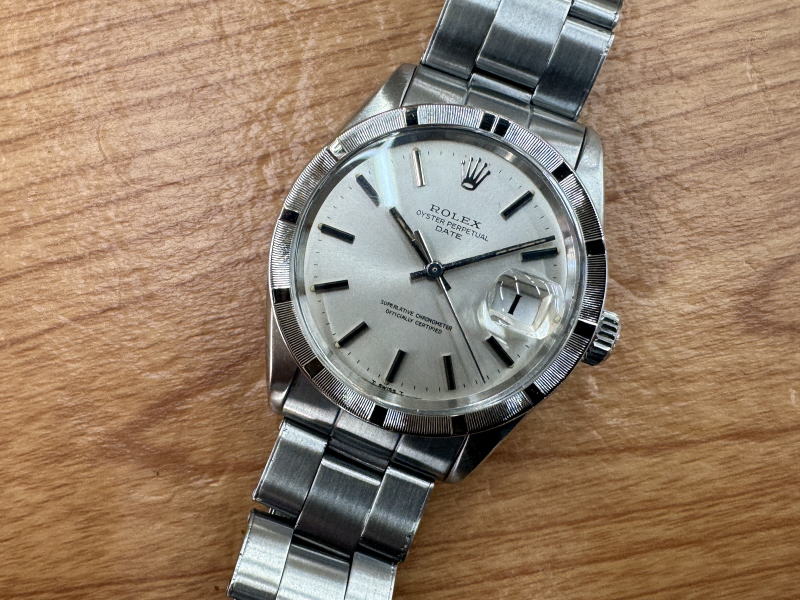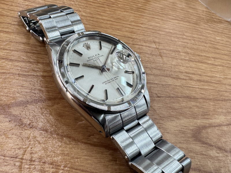 現行では見られないエンジンターンドベゼル、リベットブレスのディテールはこの年代のロレックスならではです。